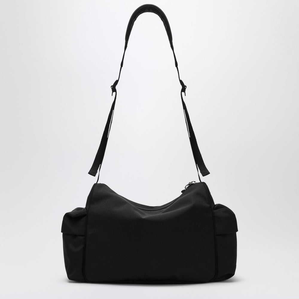 Small travel bag by Balenciaga in black recycled nylon, featuring an adjustable shoulder strap, logo label on the front, multi-pocket design, zip closure, one main compartment, and one internal flat pocket.
