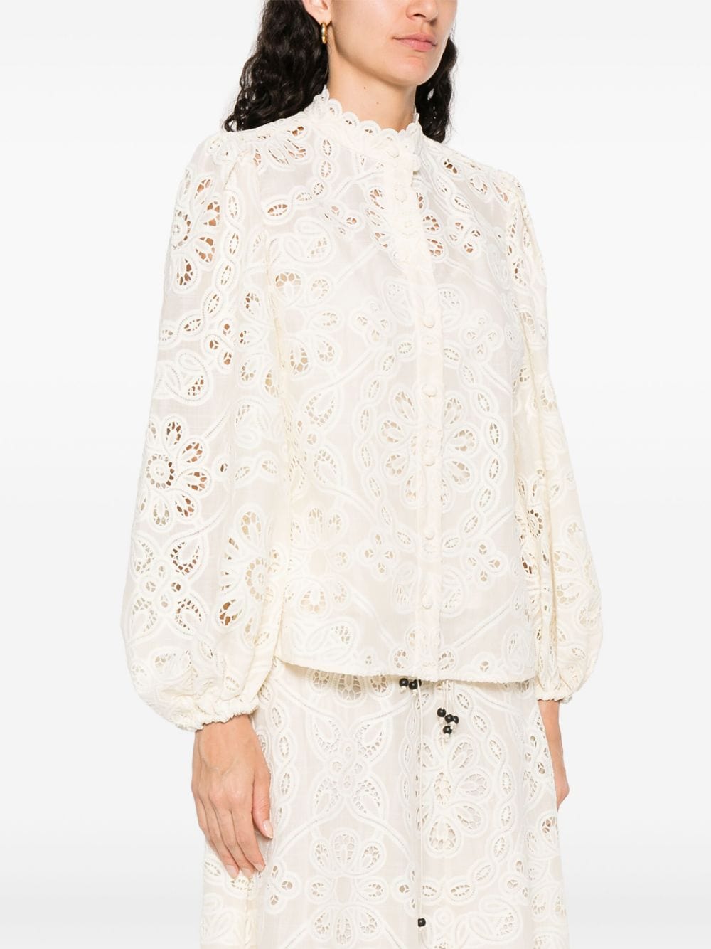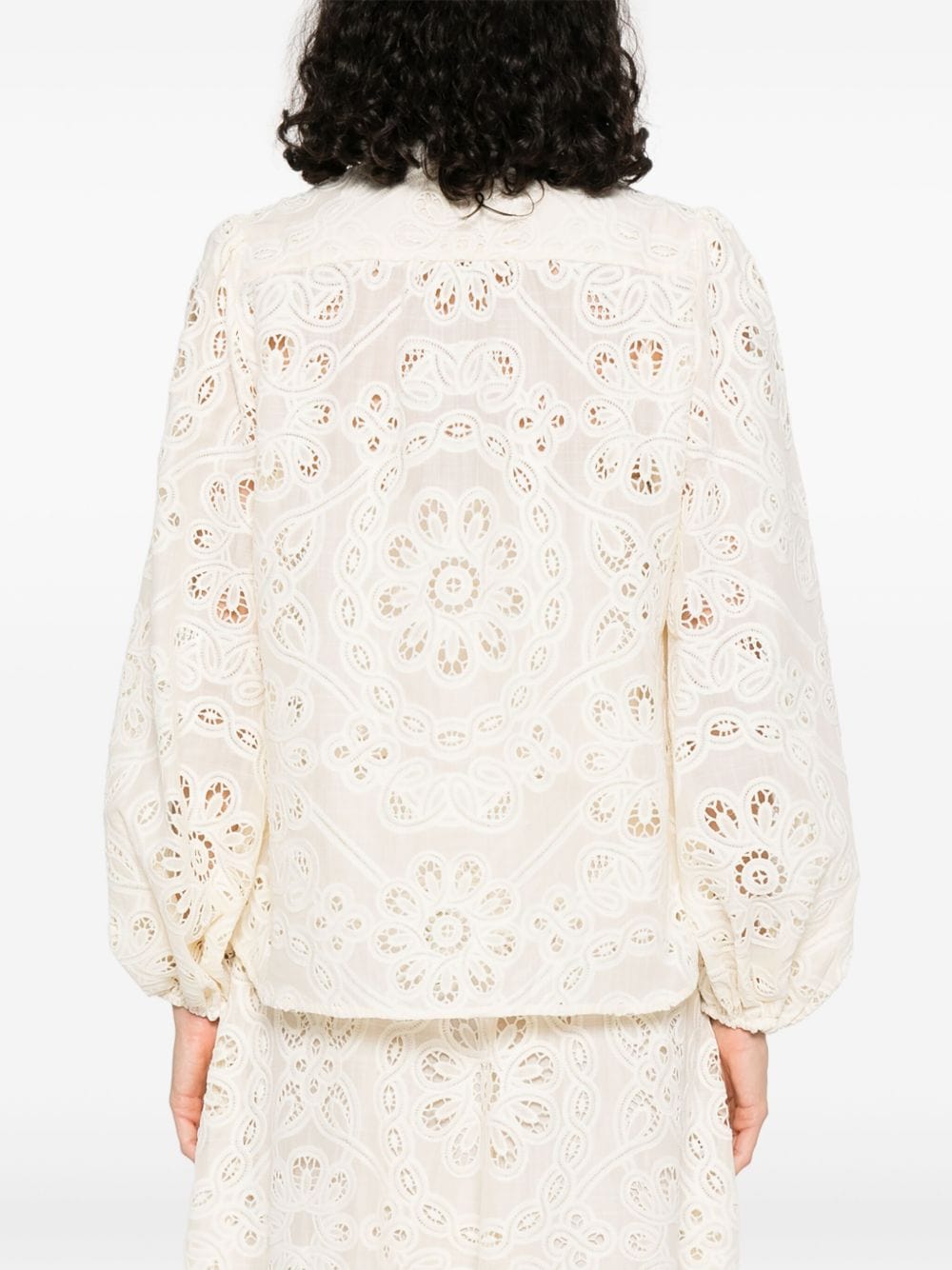 beige front button fastening cut-out floral detailing long sleeves elasticated cuffs Rhiannon embroidered blouse